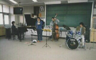 谷口さんが指導していらっしゃる、周桑郡小松中学校「小松タイム」軽音楽クラブにて演奏。広い音楽室に1年生から3年生約40人が集まってくれました。みんななぜか遠巻きに座っていました。今ヒット中の「エヴリシング」を歌ったら、女子生徒が一緒に歌ってくれました。