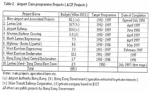 Within the above, the Port and Airport Development Strategy (PADS) is the main part of the overall infrastructure provisioning scheme. The total project sum of PADS, which was modified in April 1993, reached HK$163.7 billion (US$21.2 billion). PADS and other basic schemes contain various construction projects, which are collectively called Airport Core Programme projects ( ACP ). Construction of the new airport was the main objective of ACP but it included other major projects. These include 34 kilometres of expressways and tunnels ; a high-speed rail link that connects the airport with centre of Hong Kong ; the worldfs longest road-rail suspension bridge ; a third cross-harbour tunnel between Hong Kong and Kowloon Peninsula, and a new town development. The total estimated cost of the entire ACP is HK$ 155.3 billion ( US$ 20 billion ) in Money of the Day terms. Within the ten projects of ACP, seven of the projects were funded and carried out by the Government as direct capital works projects. The Airport Authority Hong Kong built the new airport and the Mass Transit Railway Corporation provided the railway that serves the airport. Both are statutory bodies wholly owned by the Government. The Western Harbour Crossing, the new cross-harbour road tunnel, was built by the private sector under a 30-year "build, operate and transfer" ( BOT ) franchise. Table - 2 shows ACP Projects.