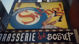 さて、ニューヨーク2日目、ミュージカルを見に行きました。水曜は大抵のミュージカルが昼の公演(マチネ)をしています。昼はミュージカル、夜はジャズ、と時間を有効に使えます。「SWING!」というミュージカル。先月から始まった新作です。まずタイトルに惹かれました。ストーリーがなく、ダンスと音楽を楽しめる、とガイドブックに案内があったので、これに決めました。「スイングしなけりゃ意味がない」で幕が開きました。8人編成のバンドがステージの上で演奏していました。1940年代、50年代のスタンダードが次々演奏され、ダンサーは踊る、はねる、回る、飛ぶ、滑る。全米ダンスコンテスト入賞などの経歴を持つダンサーばかりということで、アクロバット的な動きもあり、まばたきする暇もないほどでした。