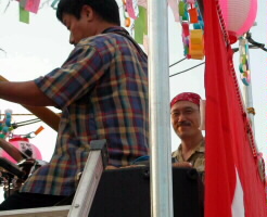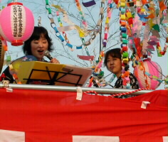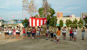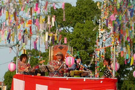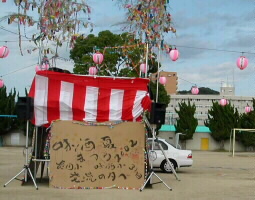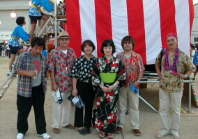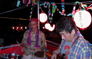 櫓の上での演奏は初体験でした。ステージの櫓を見て「この上で演奏するの〜?」とビックリ!。演奏の前に味酒小学校児童による金管バンドの演奏がありました。ヴォーカルの松原純子は夏まつりらしく浴衣で登場。 「シカゴ」をみさけ・音頭バージョンで演奏したり、味酒小の校歌をサンバにアレンジ、味酒小の姉妹校の内子町長田小の校歌をスイングにアレンジして演奏。味酒小の校歌は子供達が一緒に歌ってくれました。