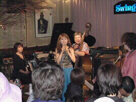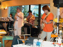 NIIHAMA JAZZ VILLAGE は5店で10バンドが出演。新居浜敷島通り周辺のあちこちで熱演の音が聞かれました。MDQ+は19:00からビザビ、21:00からサンジェルマン.ウエストに出演しました。今回は松原純子が出演できなかったので、ヴォーカルはミッシェル竹内のみでの出演でした。特にサンジェルマン・ウエストは初めての場所でした。スペシャルゲストの村田浩バップバンドの後、セッティングして「さぁ!演りますか!」と思ったら、ハイハットシンバルがない、というアクシデント発生!とりあえずハイハットなしで始めました。2曲目に村田バンドのドラムの人からお借りしたハイハットが届いてめでたしめでたしでした。 |