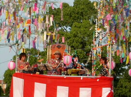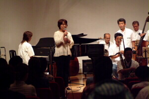櫓の上での演奏は初体験でした。ステージの櫓を見て「この上で演奏するの〜?」とビックリ!。演奏の前に味酒小学校児童による金管バンドの演奏がありました。ヴォーカルの松原純子は夏まつりらしく浴衣で登場。 「シカゴ」をみさけ・音頭バージョンで演奏したり、味酒小の校歌をサンバにアレンジ、味酒小の姉妹校の内子町長田小の校歌をスイングにアレンジして演奏。味酒小の校歌は子供達が一緒に歌ってくれました。