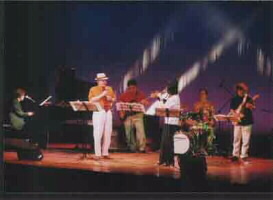 | 「ル・レ・ラ」でライブ | 今治市公会堂ステージ | 京都のサウンド トラップ オーケストラのメンバーと 伊藤君子さん |