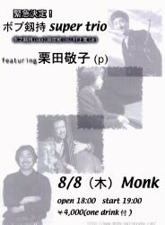 | 16 | 火 | MONK Tuesday Live | 21:00〜23:00 | MONK | 栗田敬子トリオ(渡辺綱幸B、佐々木千之DR) |