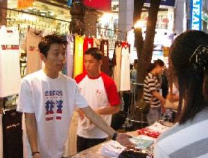 明洞でTシャツを売る崔(チェ)さん(冬はマフラーや帽子)